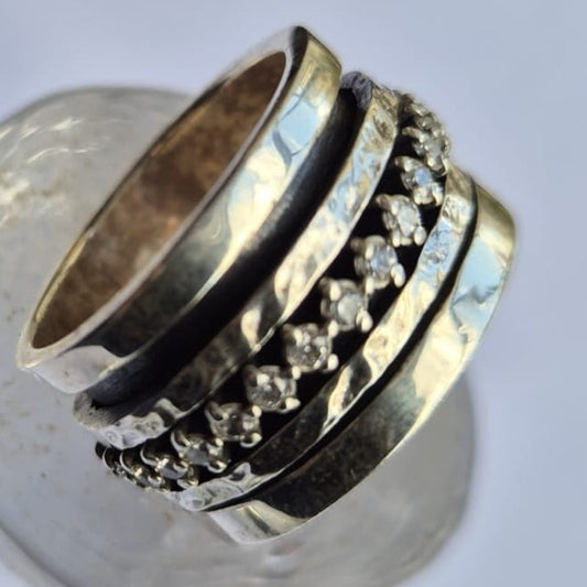 Spinner Ring Sterling Silver & Gold with Zircons – Wide Meditation Ring – Handmade Israeli Jewelry