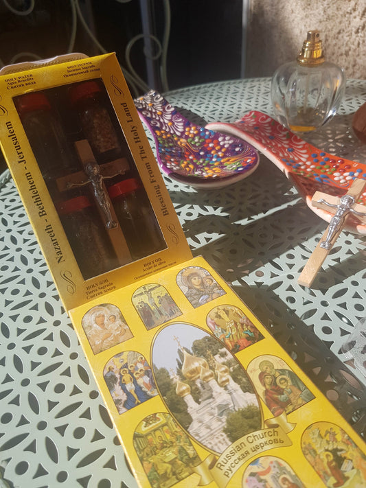 Bluenoemi Croix en Bois Chapelet Eau Huile Terre Encens Croix en Bois d'Olivier Bethléem Jérusalem Terre Sainte