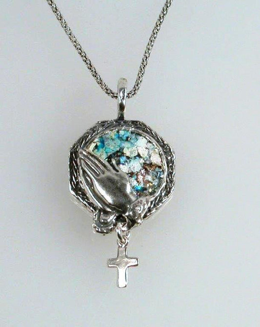 Pendentif Croix Chrétienne, Croix martelée en Argent Sterling, Croix en Verre Romain et Pierres Précieuses