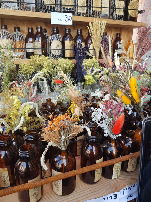 Bouquet de fleurs séchées dans une bouteille en verre marron vintage.