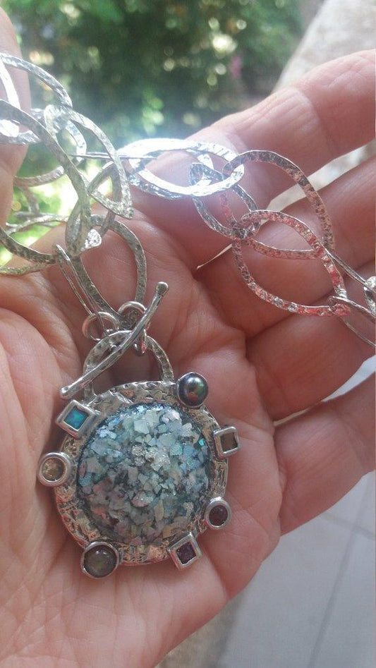Bijoux israéliens Collier artistique en argent sterling en verre romain