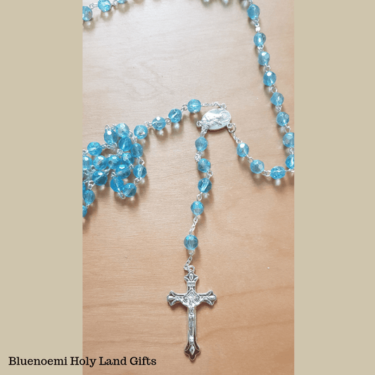 Prier le Rosaire de Terre Sainte - Croix de Jérusalem - Perles de cristaux bleus.