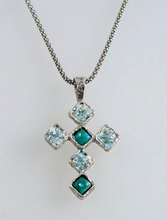 Croix en argent sterling de Terre Sainte avec verre romain serti de perles turquoise