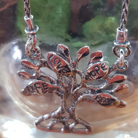 Collier arbre de vie en argent massif pour femme. Pendentif message : amour vie espoir paix